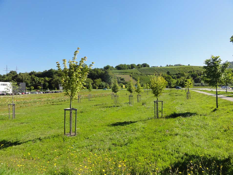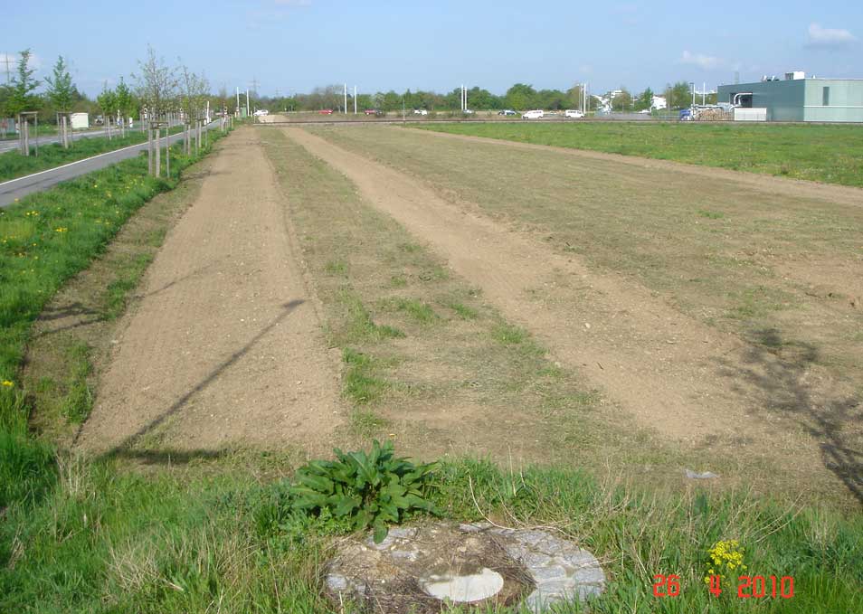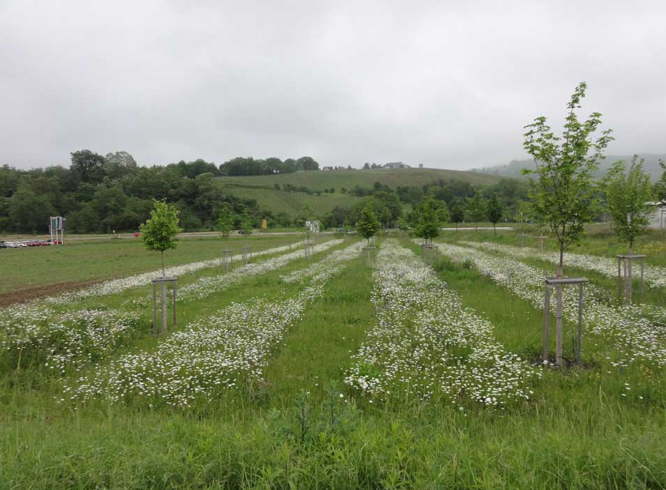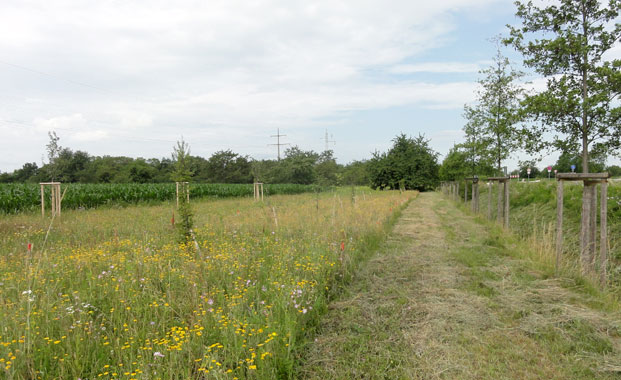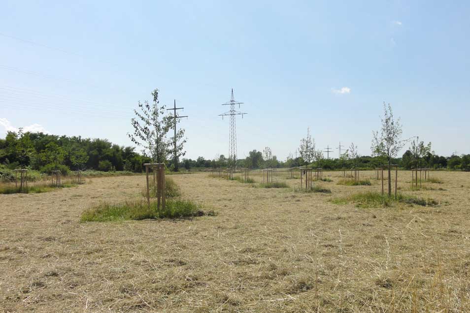 Die in mehreren Ausführungsabschnitten durchgeführte Maßnahme verteilt sich auf 10 Einzelflächen mit einer Gesamtgröße von ca. 2,5 ha. Außer Einsaaten unterschiedlicher Zusammensetzung mit Wildkräuteranteilen aus süddeutscher Herkunft wurden Hecken aus gebietsheimischen Gehölzen angelegt und regionstypische Streuobstsorten als Hochstämme sowie Laubbäume gepflanzt. Bei den Baumstandorten waren mehrere Hochspannungs-Freileitungen und diverse unterirdische Ver- und Entsorgungsleitungen zu berücksichtigen. Die Aufgabe umfasste alle Leistungsphasen vom Entwurf bis zur Überwachung der Fertigstellungs- und Entwicklungspflege.