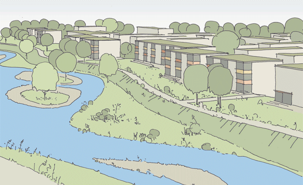 Auf der neuen Dammkrone entstehen in angemessenem Abstand zum Dreisamufer versetzt angeordnete 4-geschossige Baukörper, die das Wohnquartier vor Schallemissionen des Zubringer und der Paduaallee schützen. Die in sich kompakten Baukörper mit Loggia nach Westen werden mit einer direkten Lage an der Dreisam und einem fulminanten Ausblick auf Schwarzwald und Vogesen entschädigt. Im Inneren liegen 3-geschossige Baukörper, die sowohl als Reihenhäuser, als auch als Geschosswohnungen umgesetzt werden können. Die besonderen Bodenverhältnisse erschweren den Bau von Tiefgaragen, wie sehr gut am Beispiel des Hotelneubaus „Hirschen“ und im Gebiet „Tränkematten Süd“ abgelesen werden kann. Deshalb wird vorgeschlagen, in den östlichen Dreisamdamm ebenerdige Sammelgaragen einzuschieben, die die privaten Stellplätze für das gesamte Quartier aufnehmen. Die benachbarten Wohnstraßen können deshalb stellplatzfrei ausgebildet werden und die Wohnhäuser haben ohne hohen Gebäudesockel einen direkten Bezug zu den Außenräumen.