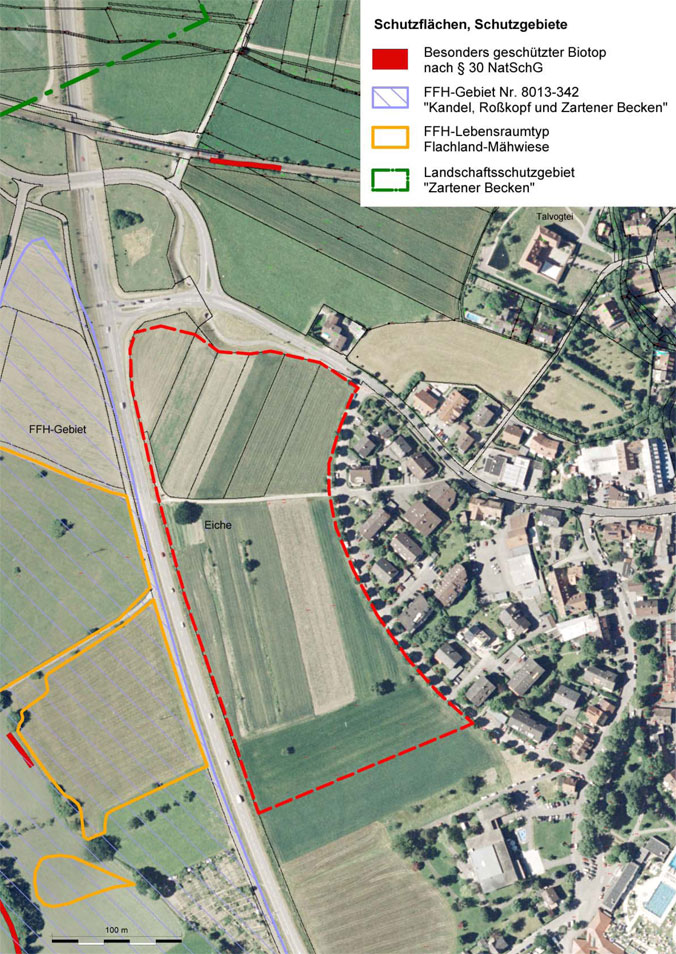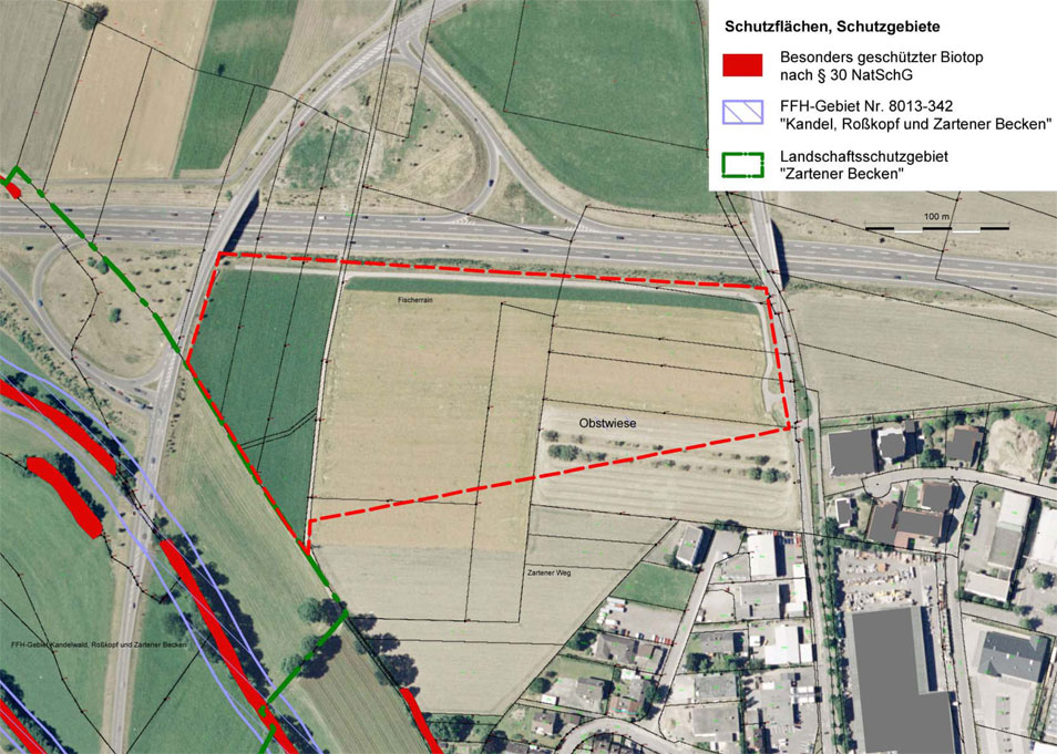 Von den umgebenden Straßen B 31 und L 126 gehen bereits erhebliche Lärmemissionen aus, so dass die zusätzliche Belastung durch Verkehr und die Emissionen aus den zu erwartenden Betrieben voraussichtlich keine erheblichen Umweltauswirkungen haben werden. Das Gelände ist arm an Landschaftsstrukturen, doch der Eingriff in den Boden ist erheblich.